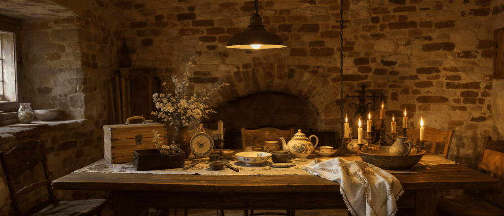 Que ce soit une commode ancienne en bois brut, une planche à pain gravée, ou un cadre en fer forgé, chaque pièce devient un élément de conversation et de transmission.