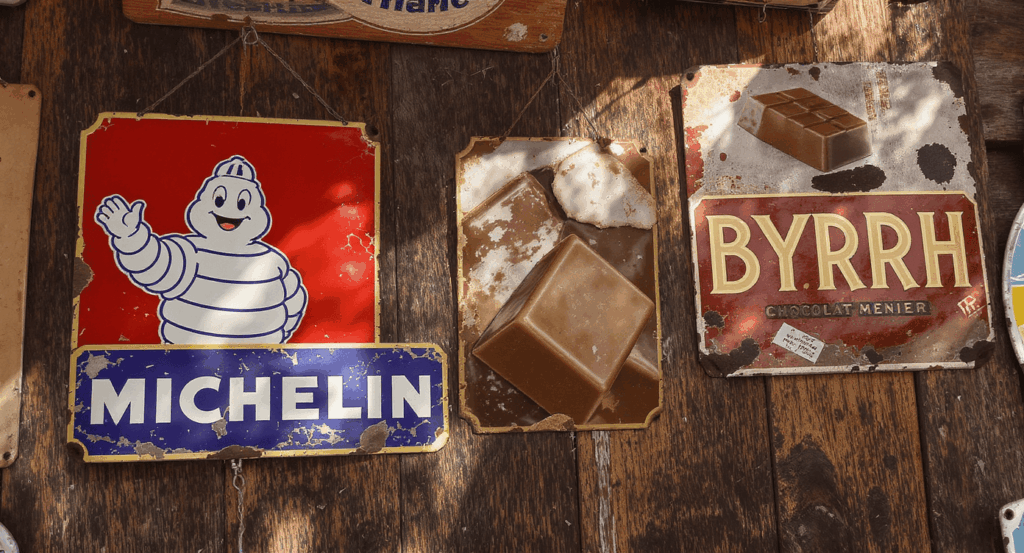 Les enseignes liées aux marques automobiles (Michelin, Total, Shell), aux chocolatiers (Menier, Poulain), aux boissons (Coca-Cola, Byrrh, Suze) ou aux cigarettes figurent parmi les plus convoitées. Une plaque émaillée Michelin en bon état peut valoir entre 200 et 2000 euros selon sa taille et sa rareté.