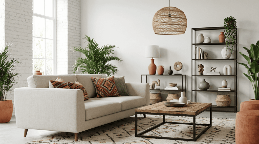 L’alliance du scandinave et du bohème crée une atmosphère à la fois épurée et chaleureuse. Le secret réside dans la modération : conservez la base minimaliste nordique et ajoutez des touches bohèmes mesurées à travers quelques textiles, plantes exotiques et accessoires voyageurs.
