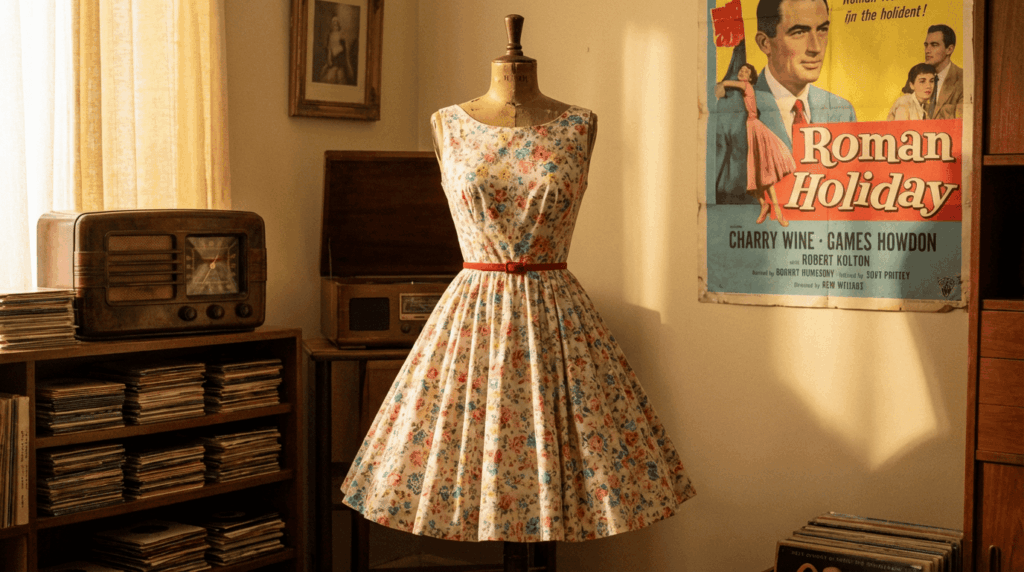 Les merceries et magasins de tissus proposent aujourd’hui de nombreux imprimés rétro qui évoquent parfaitement l’esprit des années 50. Recherchez les motifs à pois, les fleurs vintage, les rayures et les couleurs vives caractéristiques de cette période. N’oubliez pas les fournitures essentielles : fermetures éclair invisible, biais assorti, entoilage pour structurer le corsage et éventuellement les boutons décoratifs.