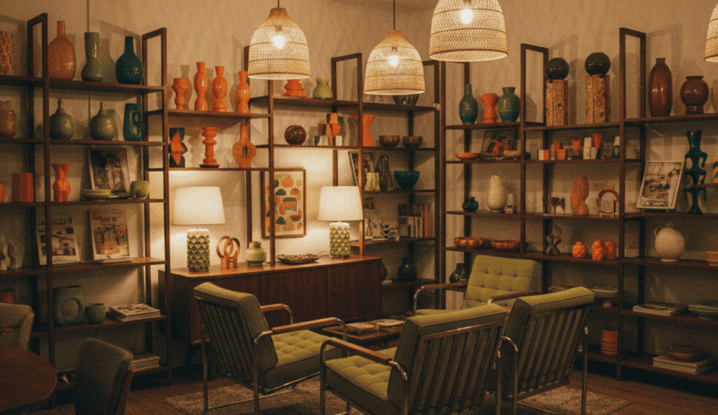 Une décoration 100 % 70’s peut facilement devenir excessive ou datée. Le secret est de mélanger : quelques éléments vintage forts, associés à des pièces modernes épurées. Par exemple, un canapé courbe vintage dans un salon contemporain aux murs neutres, ou une lampe champignon placée sur une table moderne en bois clair.