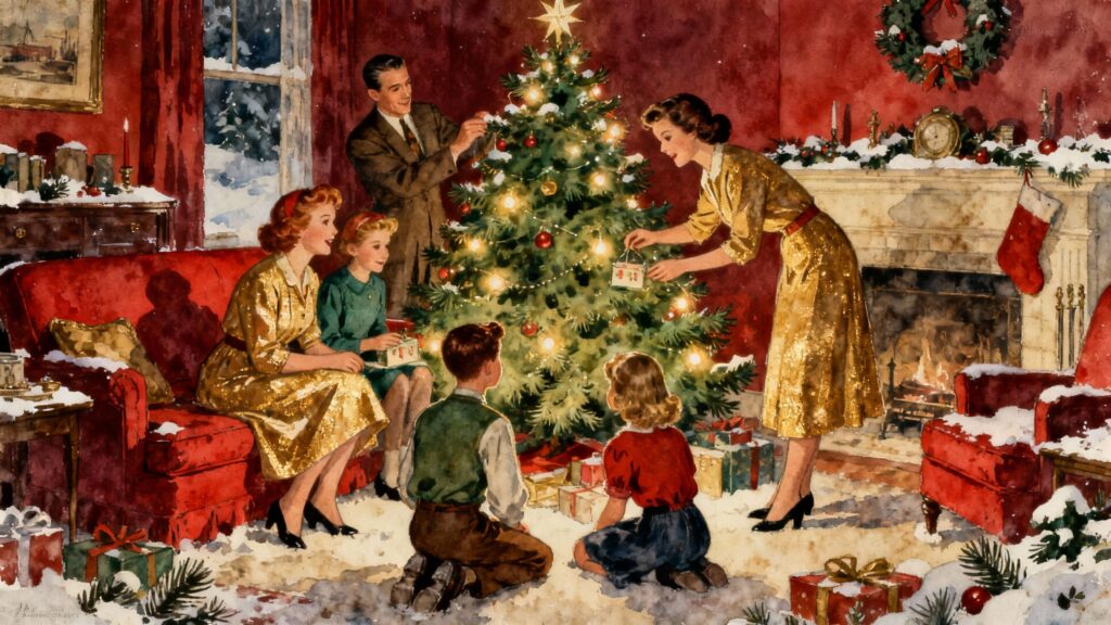 Les années 1950 marquent l’apogée de l’esthétique kitsch et colorée du noël américain. Cette période d’après-guerre, caractérisée par l’optimisme et la prospérité économique, se reflète dans les décorations de Noël de l’époque. Les boules multicolores en verre soufflé côtoient les premiers ornements en plastique, matériau révolutionnaire qui démocratise la décoration festive.